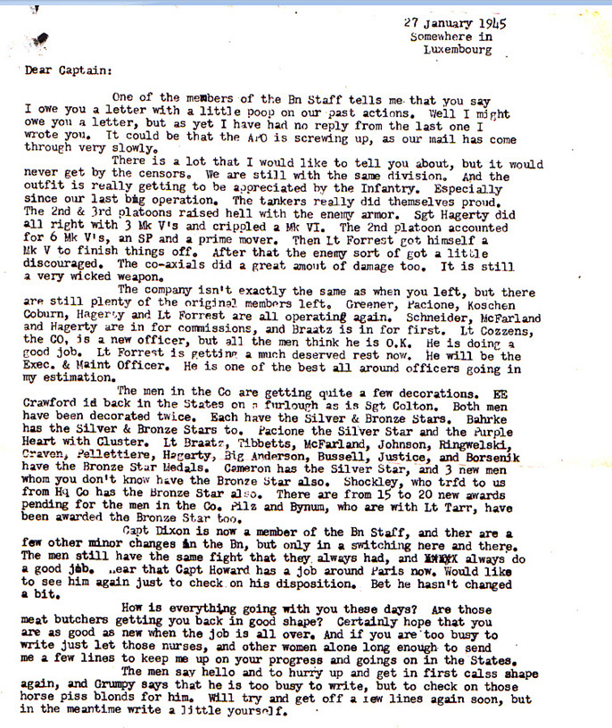 Years later, Colonel Merrill’s wife, Jan, gave me a photocopy of the letter in which Vinson mentioned Tarr’s platoon. It was written shortly after the Battle of the Bulge and some of the events took place in Oberwampach, where A Company withstood between seven and nine armored counterattacks over the course of two days.